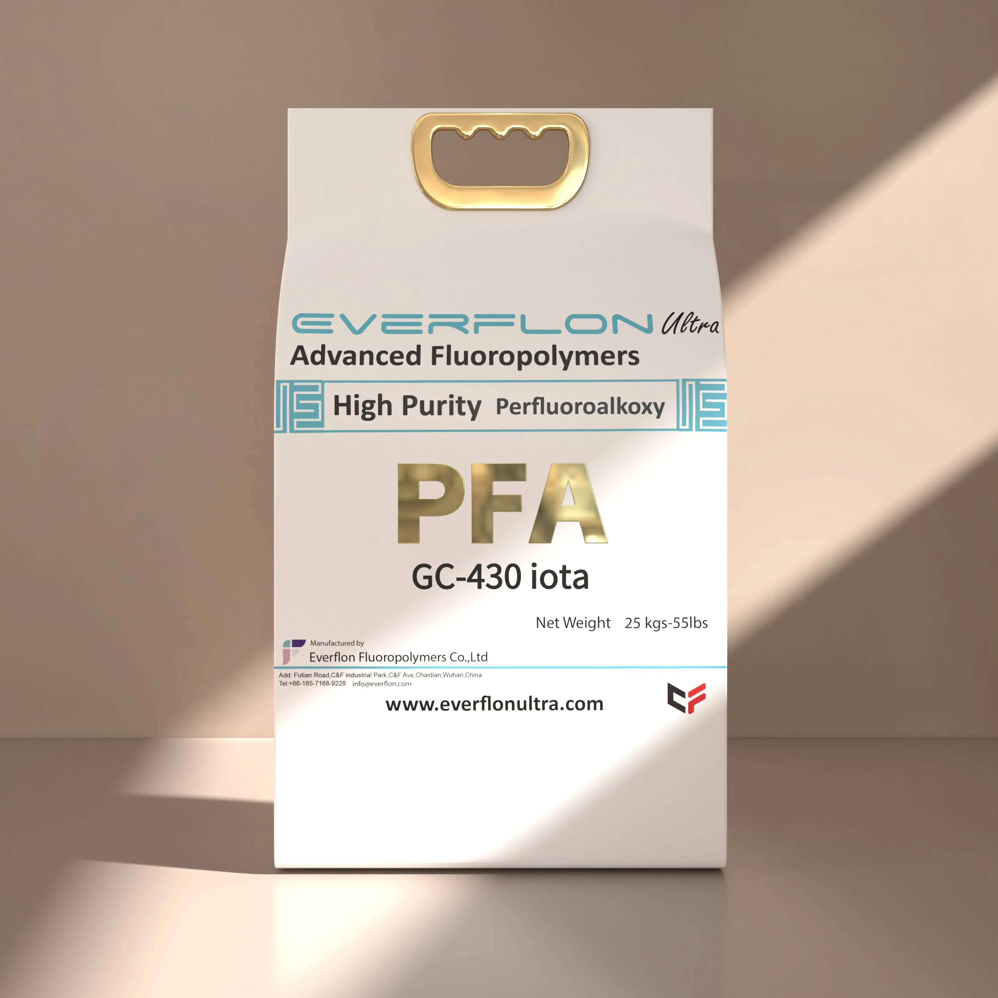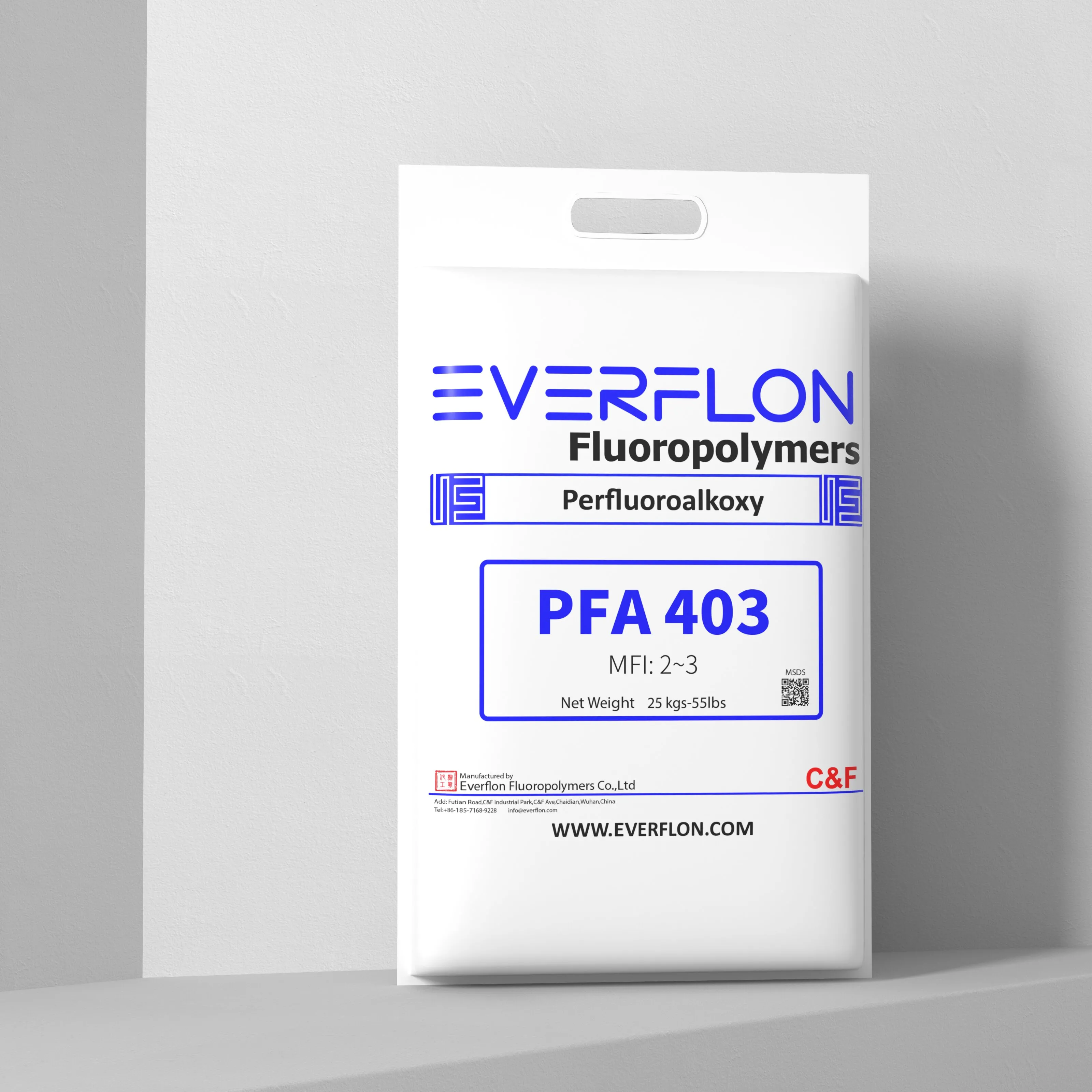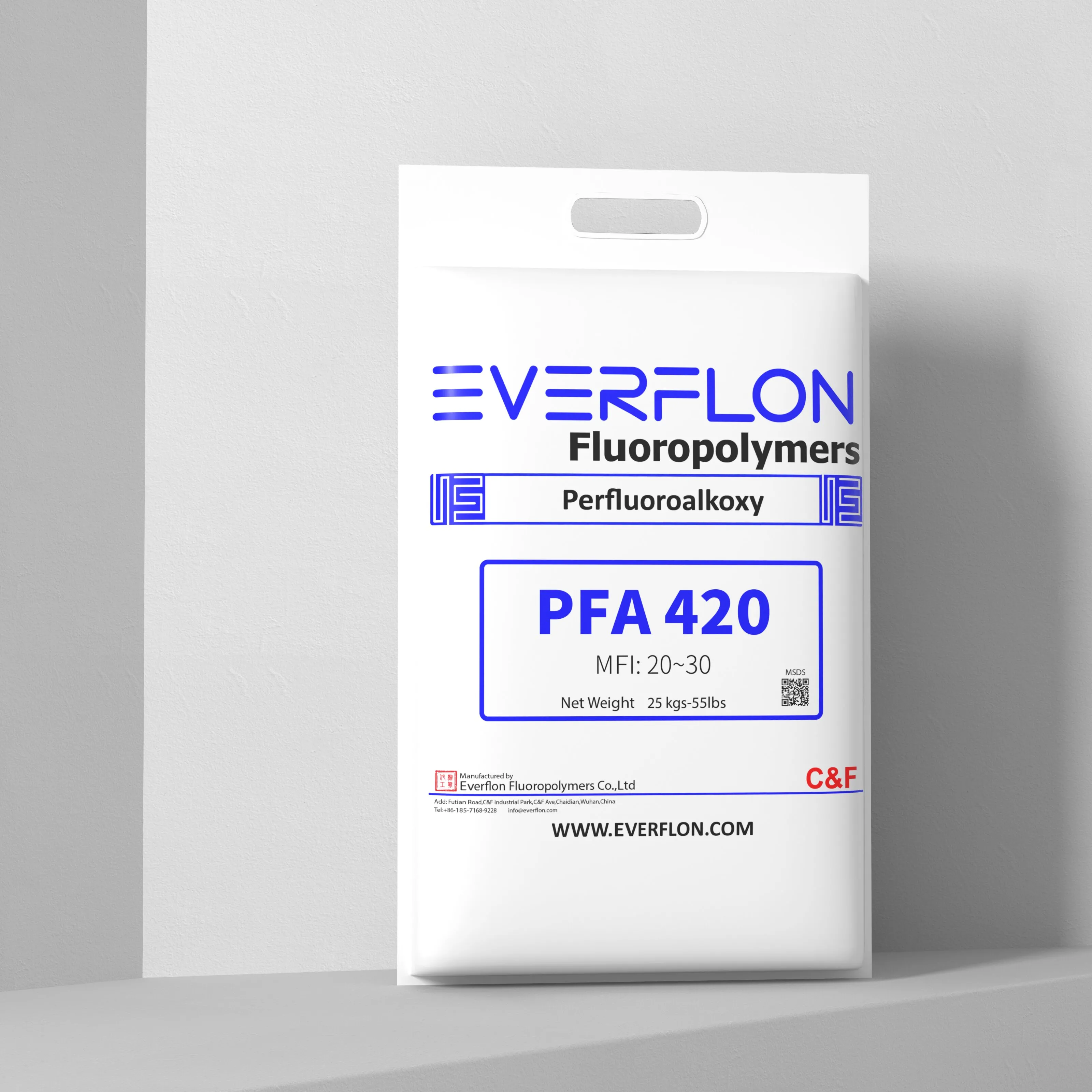 Les propriétés de la résine Everflon™ PFA restent inchangées quelle que soit la durée de stockage. Les conditions de stockage ambiantes doivent être adaptées afin d'éviter toute contamination par l'air et la condensation d'eau sur la résine lors de son déballage. La résine Everflon™ PFA est fournie sous forme de granulés et conditionnée en sacs multicouches de 25 kg avec doublure intégrée en polyéthylène.